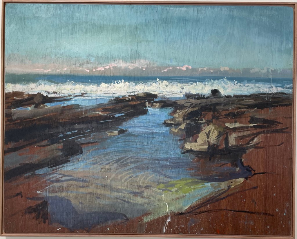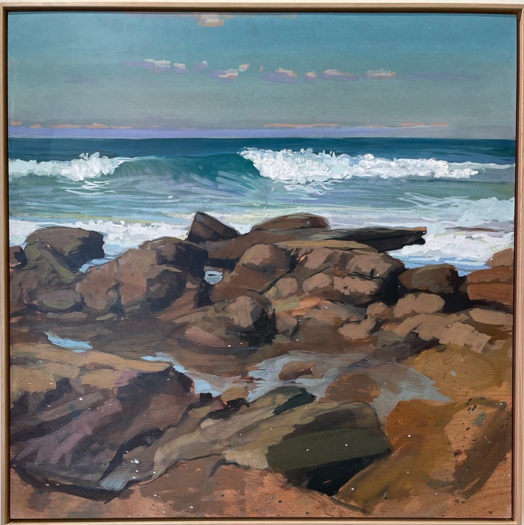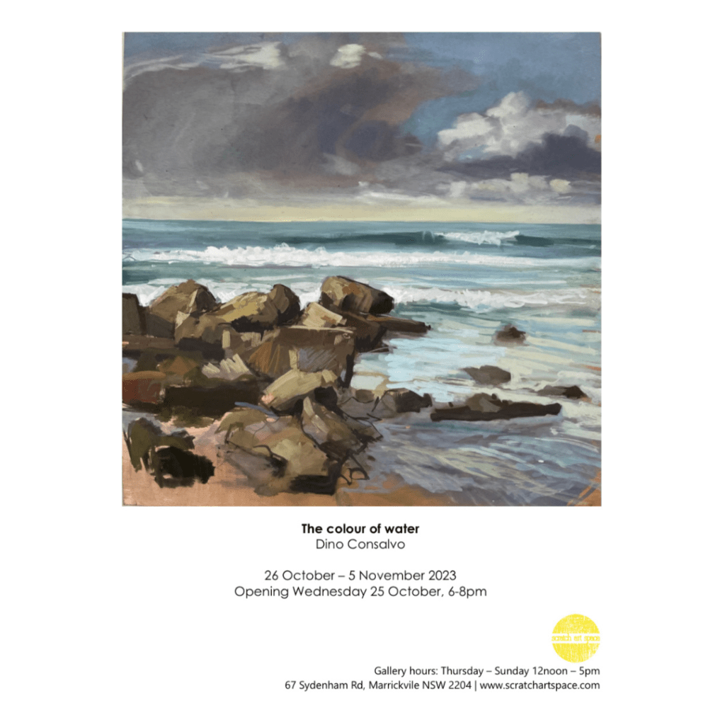 “I work using my accumulated experience, I paint the movement, light, colour and mood of the area I am in. It’s a balanced dance to and from adding to a wave, sculpting the space around a rock or explaining the transparency and movement of the incoming or outgoing tide. Nothing is static…this is not still life. The water is moving, the light is changing and you have to finish before you get washed off the rock.” Dino Consalvo