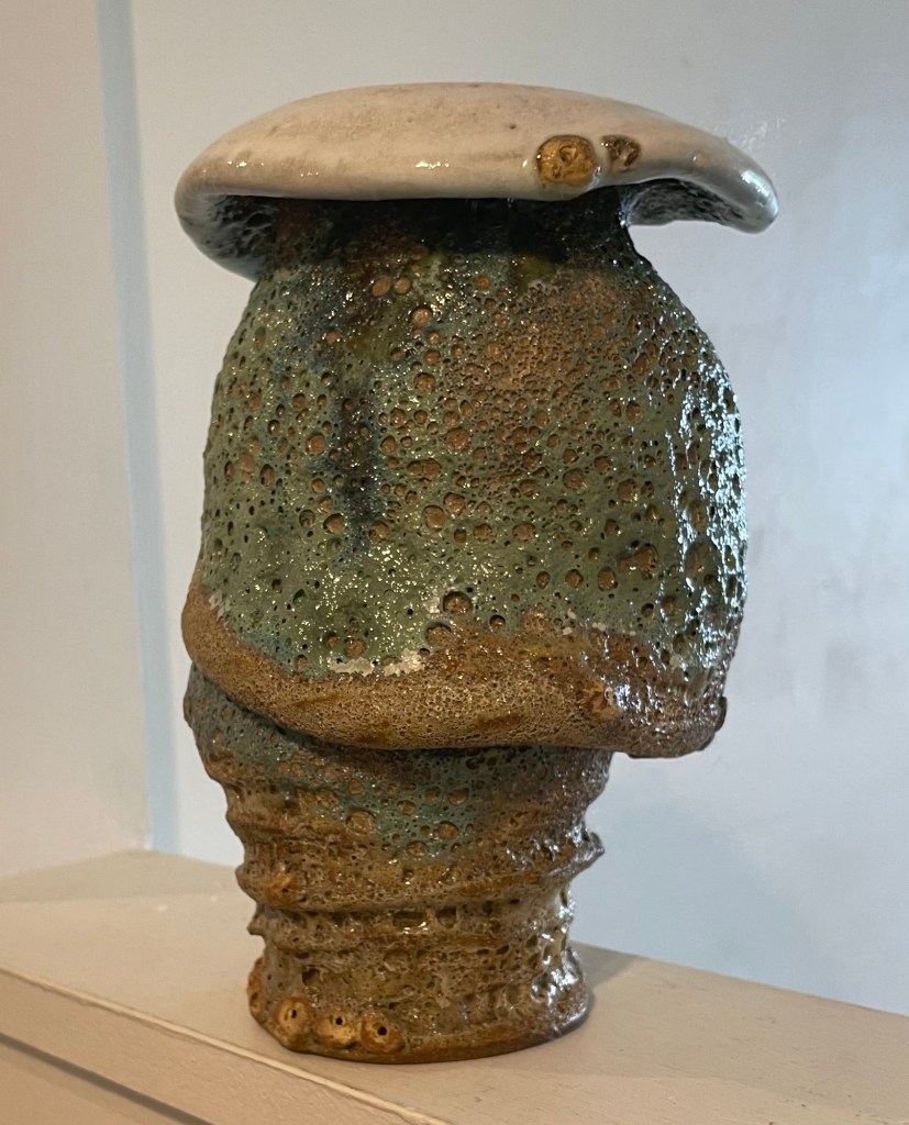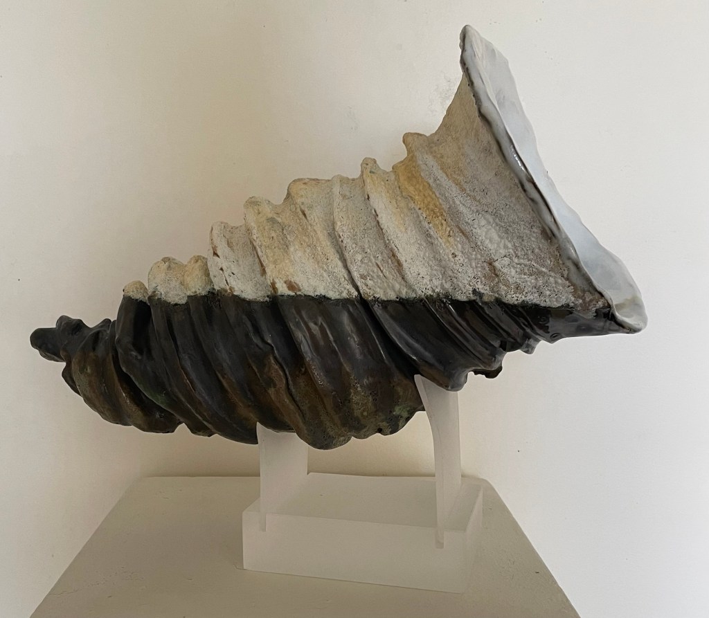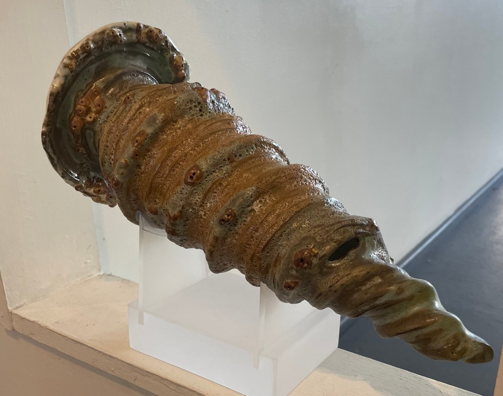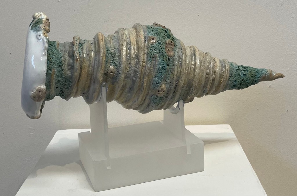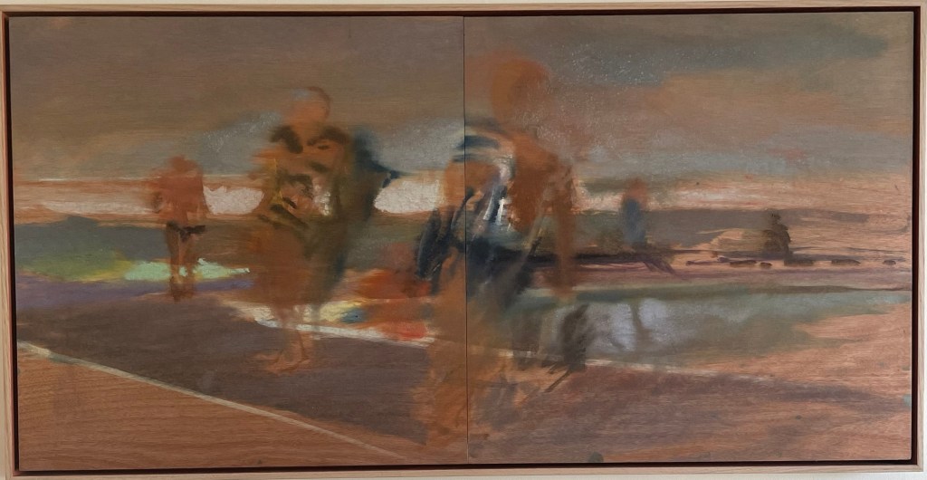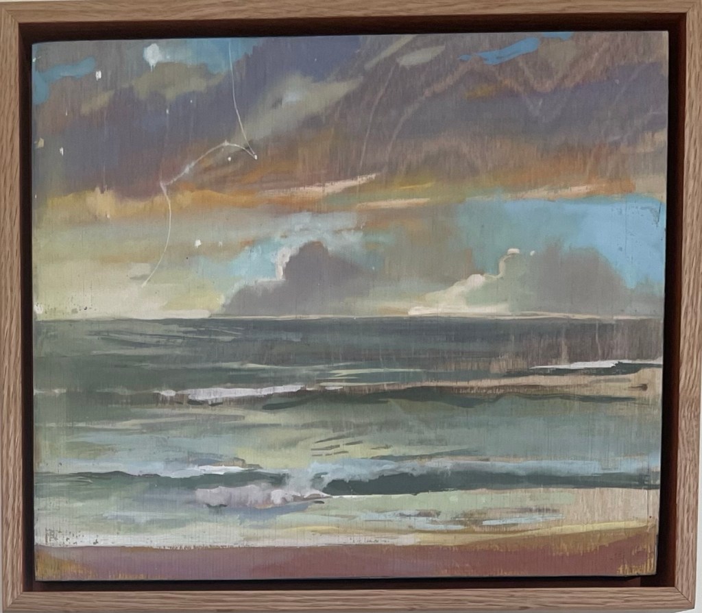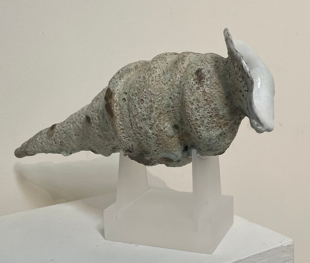 The figurative work like this one (End of Summer) forges a direct link to the early Australian Impressionist painters, not because of a formulated approach but through total absorption in the Australian atmospheric light and the moment. You can smell and feel the morning as well as feel the breeze and early sun on your skin. In these works, the momentary gesture rules, where realism is created by the most abstract of strokes. The paintings are twinned with sunning ceramic pieces documenting shells and organisms found amongst the rocks. Mastery of colour glazes matching nature and complementing the paintings. Don’t miss this humble but totally stunning show.